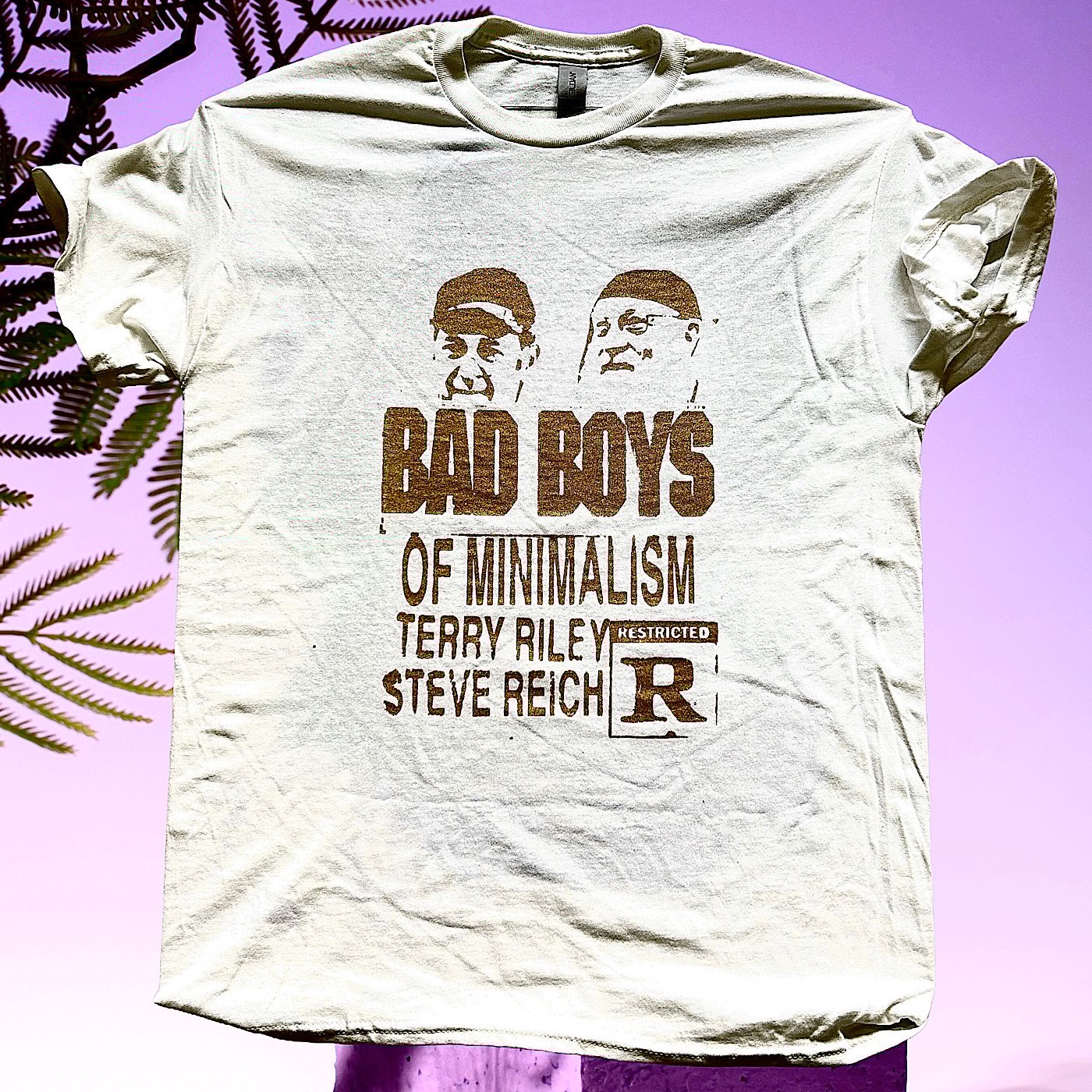 Tribute to two goats, composers Steve Reich and Terry Riley. Printed with gold ink on adult white Gildan shirts. Shirts made to order. Please allow 2-4 weeks for shipping.
